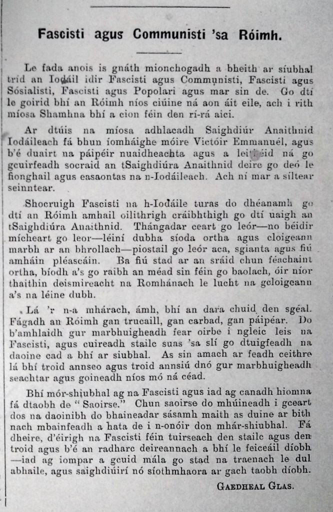 Lá ’r n-a mhárach, ámh, bhí an dara chuid den sgéal. Fágadh an Róimh gan trucaill, gan carbad, gan páipéar. Do b’amhlaidh gur marbhuigheadh fear oi[bre] i ngleic leis na Fascisti, agus cuireadh stailc suas ’sa slí go dtuigfeadh na daoine cad a bhí ar siubhal. An sin amach ar feadh ceithre lá bhí troid annseo agus troid annsiú dnó gur marbhuigheadh seachtar agus goineadh níos mó ná céad.