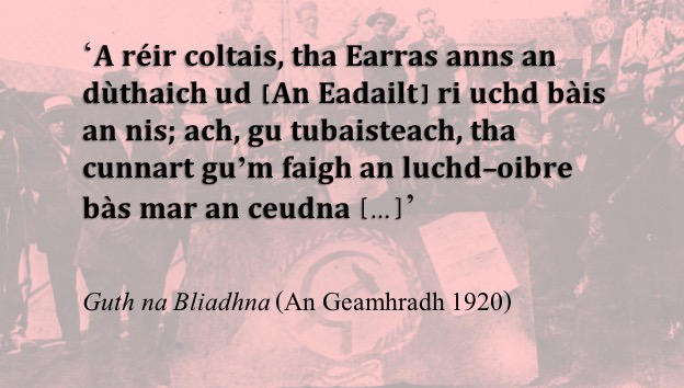 Bha ceist orm, sa bhratha-bhloga mu dheireadh, an rachadh agam air rudeigin co-aimsireil a lorg ann an Gàidhlig mun Bhiennio Rosso (An Dà Bhliadhna Dhearg) – 1919-1920 – san Eadailt. Lorg, gu dearbh fhèin! Agus tha mi an dùil gu bheil tuilleadh iomraidhean air tachartasan Eadailteach ann an tùsan eile air nach fhaigh mi cothrom an ceartuair.