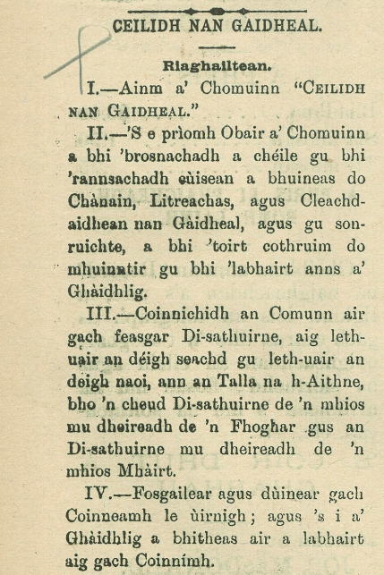 (Deas) Ceithir de na deich riaghailtean a bha aig Céilidh nan Gàidheal. A’ sealltainn an àite-coinneachaidh aca ann an Talla na h-Àithne, agus cho cudromach ’s a bha labhairt na Gàidhlig sna coinneamhan. Bho Mac-Talla VI:VII (September 9, 1898).