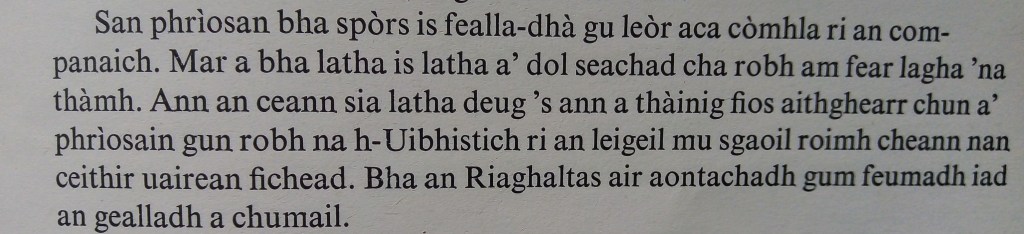 Chaidh an dithis eile don phrìosan agus bha aca ri ’deise-phrìosain’ a chur orra. Bha na h-Uibhistich eile a’ cosg aodach àbhaisteach agus nuair a chunnaic iad an dithis eile sa ghàrradh a-muigh cha do dh’aithnich iad iad. Gu dearbh, b’ ann a smaoinich iad gum b’ e ‘Sinn Féiners’ a bh’ annta – oir bha iadsan sa phrìosan aig an aon àm!