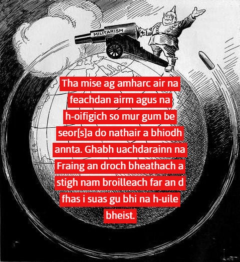 Seo mar a bhios sinn a’ cur an aghaidh cogadh agus armailteachd, a’ brosnachadh dhaoine gun a bhith a’ gabhail san arm – agus, ’s cinnteach, ag argamaid an aghaidh chogaidhean agus miotas na h-ìmpireachd, mar a bha MacMhuirich a’ dèanamh. Chan e Gàidheil a-mhàin a dh’fheumas seo a dhèanamh ach Goill, Sasannaich agus Èireannaich. ’S e rud eadar-nàiseanta a th’ ann am frith-armailteachd (anti-militarism), mar gum b’ eadh.