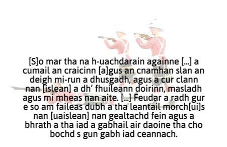 Agus ’s fhiach e ainfachadh [= aithneachadh] gun ann ri linn an smoglaidh mhor bhi na threise s a Ghaidhealtachd6 chaidh na h-urad de na Gaidheil do n arm; agus a nis air do ’n t-sluagh a ghrudaireach[d] fhagail aig daoine mor saibhir, s gann gum faigh luchd tarruinn shaighdearan duine cho faoin ’s gun eisd e riu.