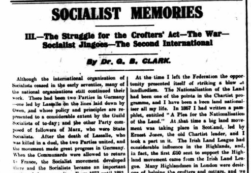 Tùs: G. B. Clark, ‘Socialist Memories: III–The Struggle for the Crofters’ Act–The War–Socialist Jingoes–The Second International’, Forward (May 22, 1920), 5.