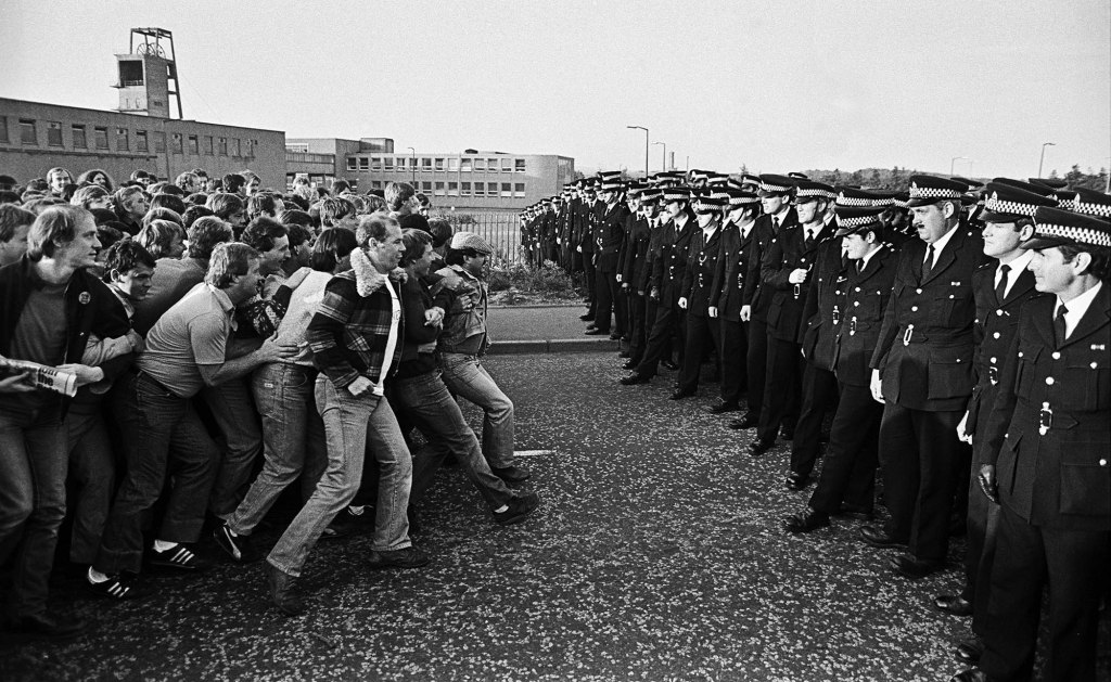Piogaid nam mèinneadairean ann an Gleann Bilston/Bilston Glen, Meadhan Lodainn, a’ toirt aghaidh air a’ phoileas, 1984.